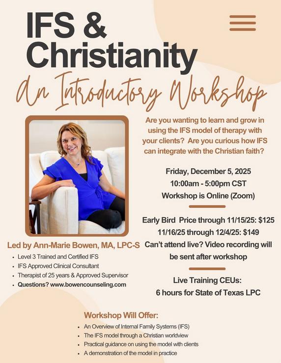 Join me on 12/5/25 for an educational workshop for professionals on the integration of IFS and Christianity!