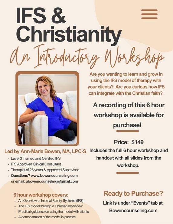 Missed this workshop on the Integration of IFS and Christianity? You can purchase the 6 hour recording for $149. Purchase the workshop HERE.